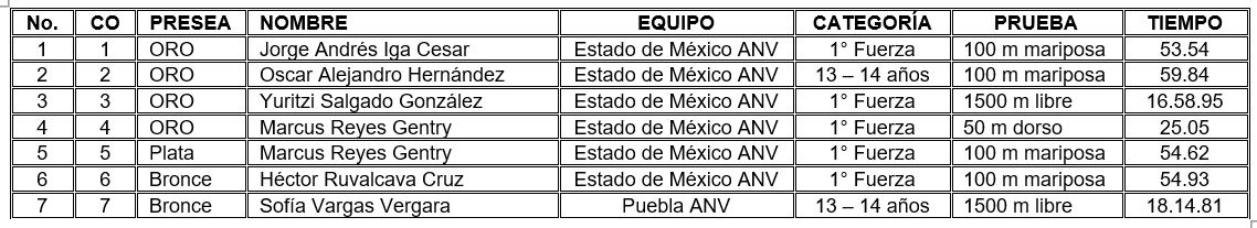 Antes de finalizar es importantes destacar la actuación de Marcus Reyes Gentry, quien consolidó dos preseas, una de ellas de oro en los 50 m dorso, esto con un tiempo, de: 25.05. Además, logró una plata en el 100 m mariposa, con: 54.62. Un gran esfuerzo del atleta que representa al Estado de México ANV, quien consolido estos dos metales en las finales de primera fuerza.